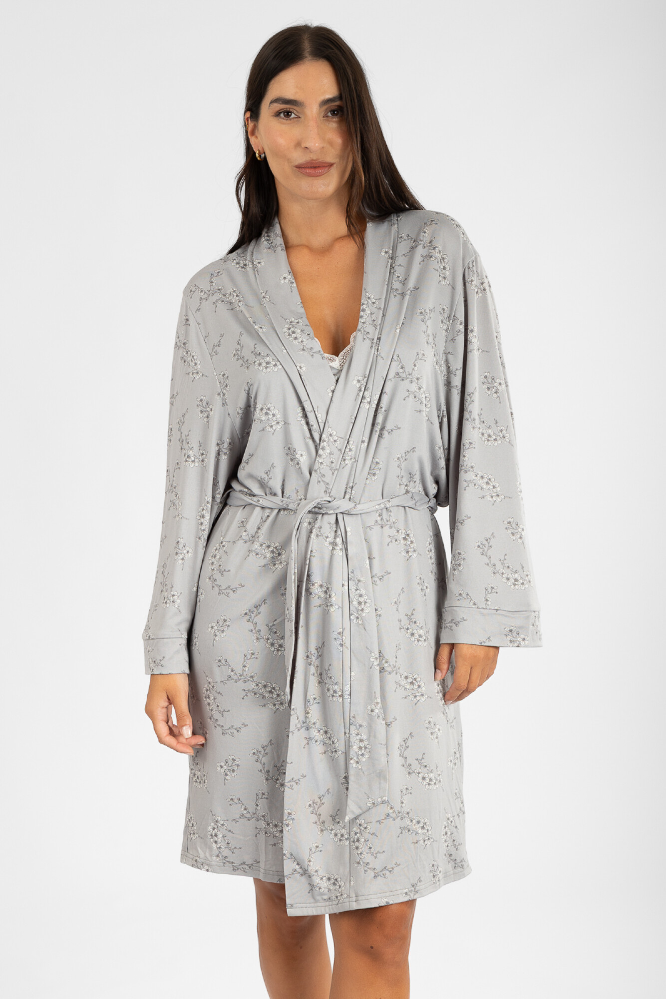 Bata en tela con textura piel de durazno, con lazo para mejor ajuste. 39676019 https://sisi.com.uy/catalogo/bata-blossom-yummy-gris_39676_019