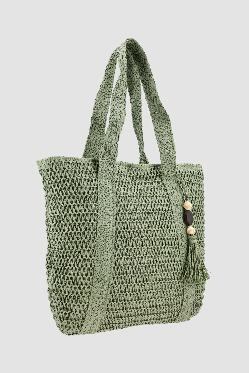 Bolso de playa tejido con colgante. Cierre metalico. Interior forrado. Composicon tela y forro: 100% papel. 39273037 https://sisi.com.uy/catalogo/bolso-manantiales-verde-malva_39273_037