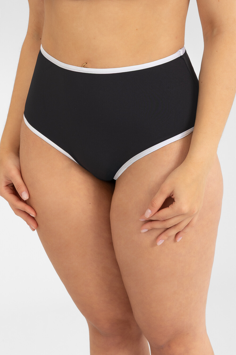 Bombacha tiro alto, con cortes vivos en contraste que le otorgan un toque vintage. Parte trasera con cobertura media. Al ser tiro alto, ejerce control de abdomen.