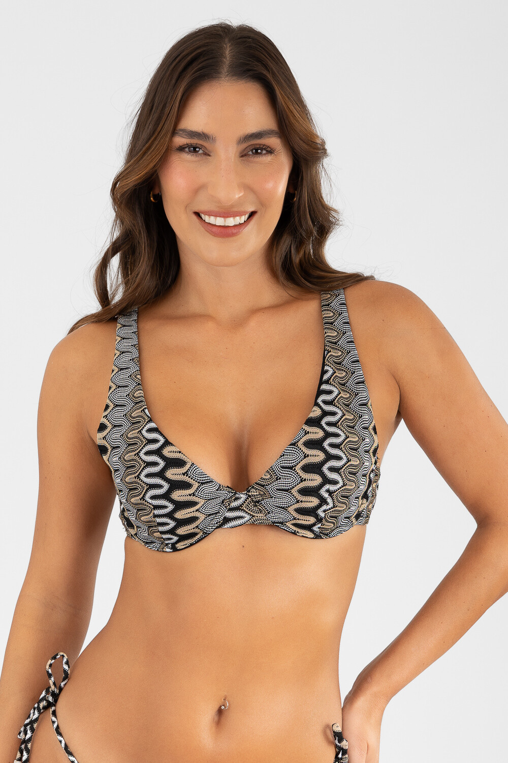 Top balconette halter, con copa removible y aros interiores. Breteles finos desmontables en la parte posterior que permiten cruzarlos o atar en el cuello. Cierre en espalda con broche metalico inoxidable.