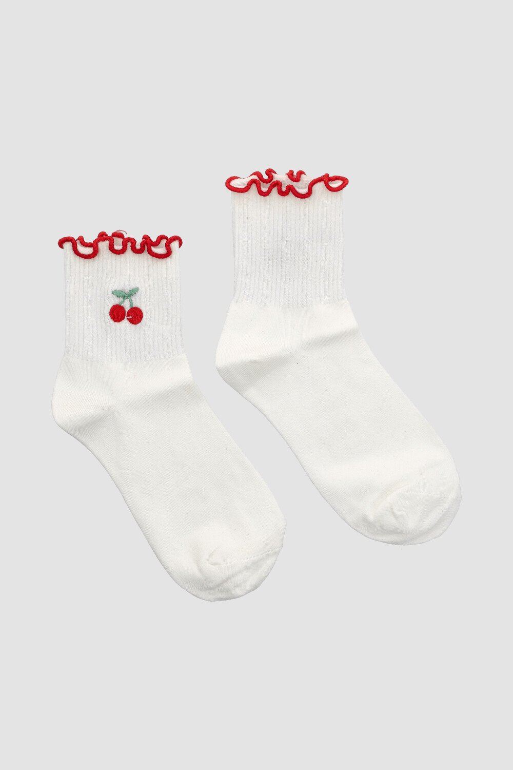Medias de dama, media caña. Con textura morely, bordado de cereza y volado en el puño en contraste. 39259100 https://sisi.com.uy/catalogo/medias-dama-casual-cerezas-variante-unica_39259_100