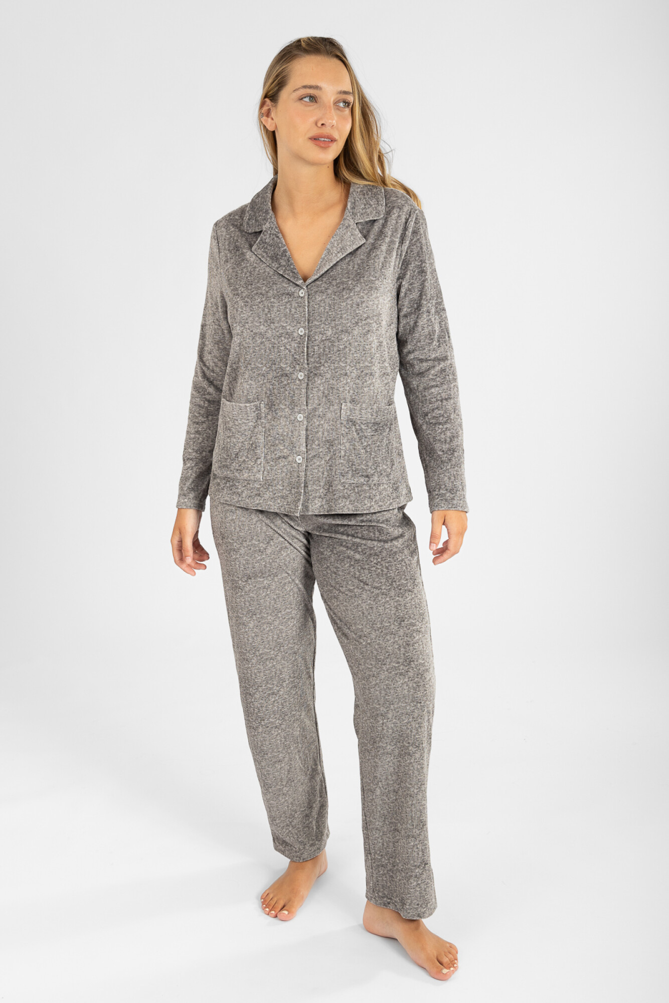 Pijama americano confeccionado en rib velour super calentito. Cuenta con cintura elastizada, delantero abotonado, cuello camisero y dos bolsillos. Ideal para combatir el frío con elegancia.
