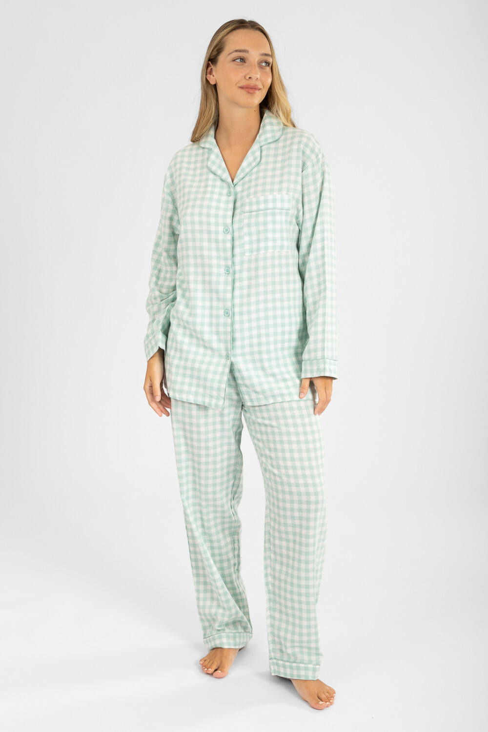 Pijama estilo americano, con remera abotonada y pantalón largo, en tejido de franela super suave y comfortable. Este conjunto estampado es un pijama perfecto para dormir o para estar super cómoda en casa.