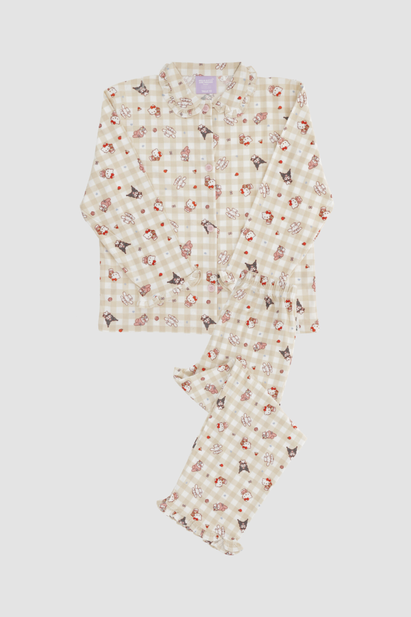 Pijama americano en tela super suave y calentita, con pantalón largo de cintura elastizada y remera manga larga, ambos estampados. 39857043 https://sisi.com.uy/catalogo/pijama-kitty-and-friends-flannel-mini-marfil_39857_043