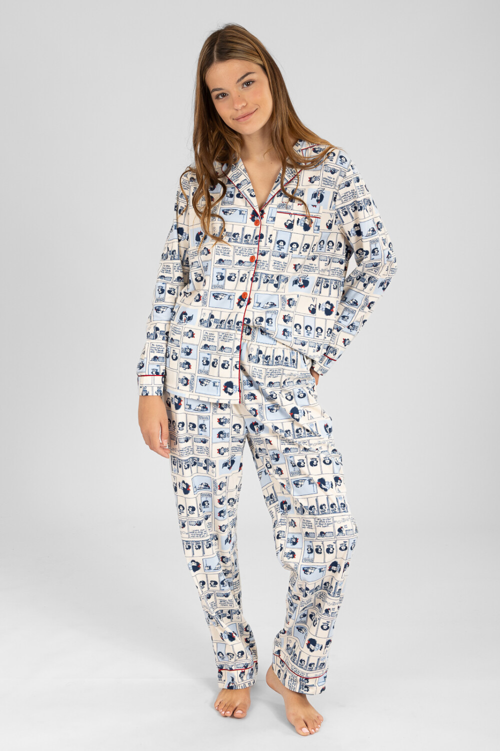 Pijama con camisa abotonada, pantalon largo con cintura elastizada, confeccionado en tejido suave y calentito. Este conjunto estampado es un pijama perfecto para dormir y mantenerse abrigada. 39737043 https://sisi.com.uy/catalogo/pijama-mafalda-2-flannel-fleece-marfil_39737_043