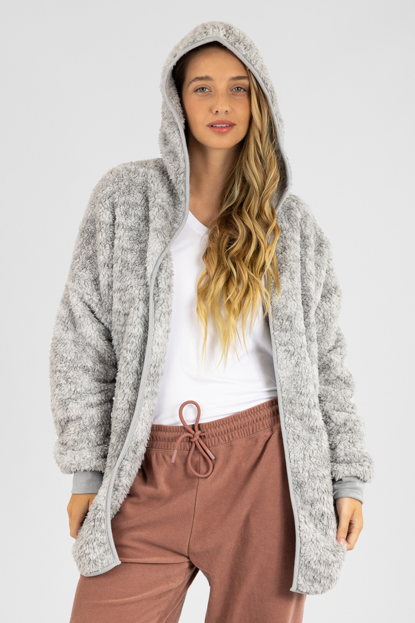 Cardigan de sherpa, muy suave y calentito con capucha. 39871019 https://sisi.com.uy/catalogo/sherpa-open-cargidan-gris_39871_019