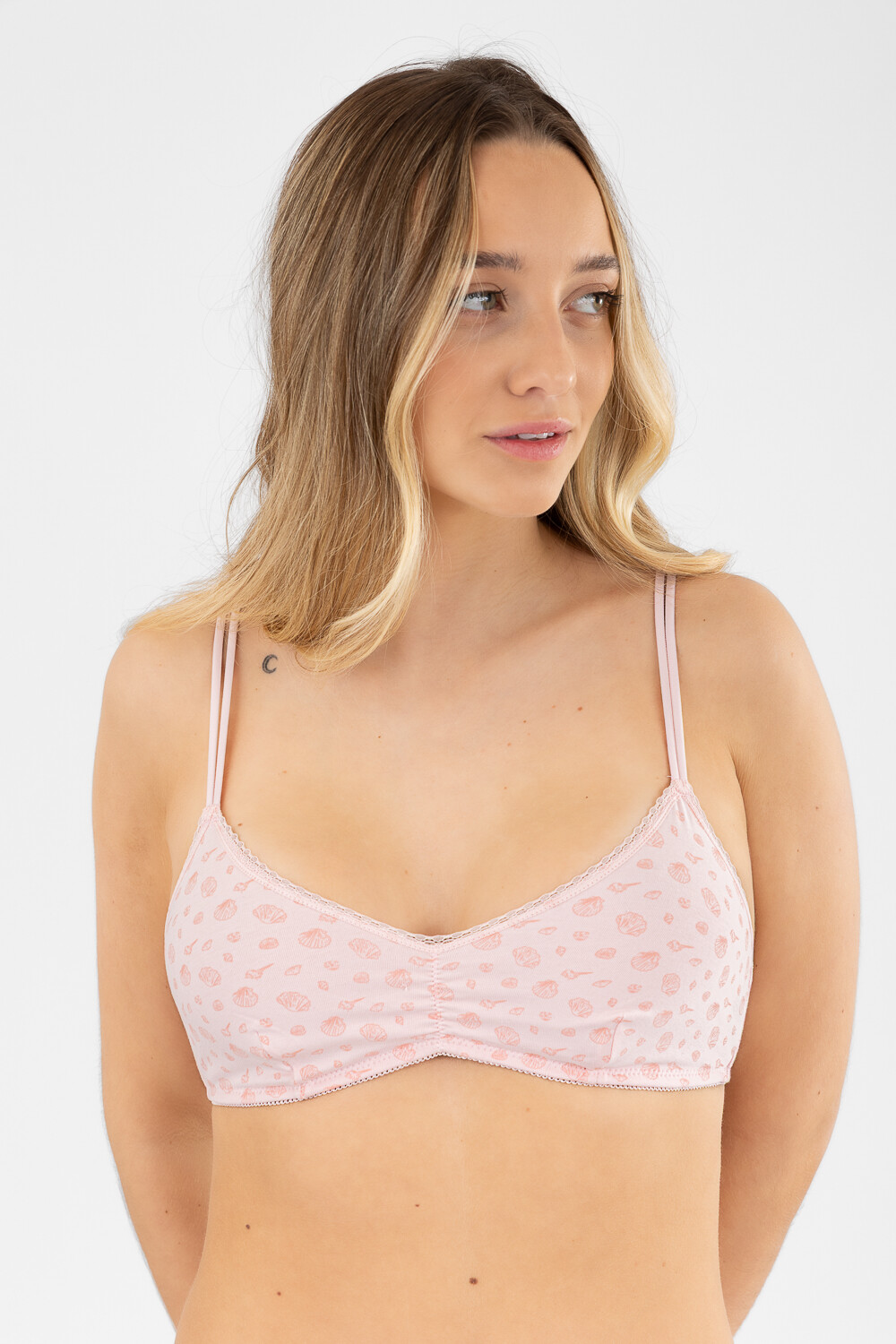 Bralet de escote triangular sin aro con copas removibles y estampa personalizada. Puntilla fina en escote y espalda que aporta delicadeza. Frunce en el centro delantero que suma un detalle femenino. Laterales con doble tejido para mayor seguridad. Breteles regulables con doble bretel delantero y broche trasero de 4 posiciones. Suave fresco y cómodo para todos los días.