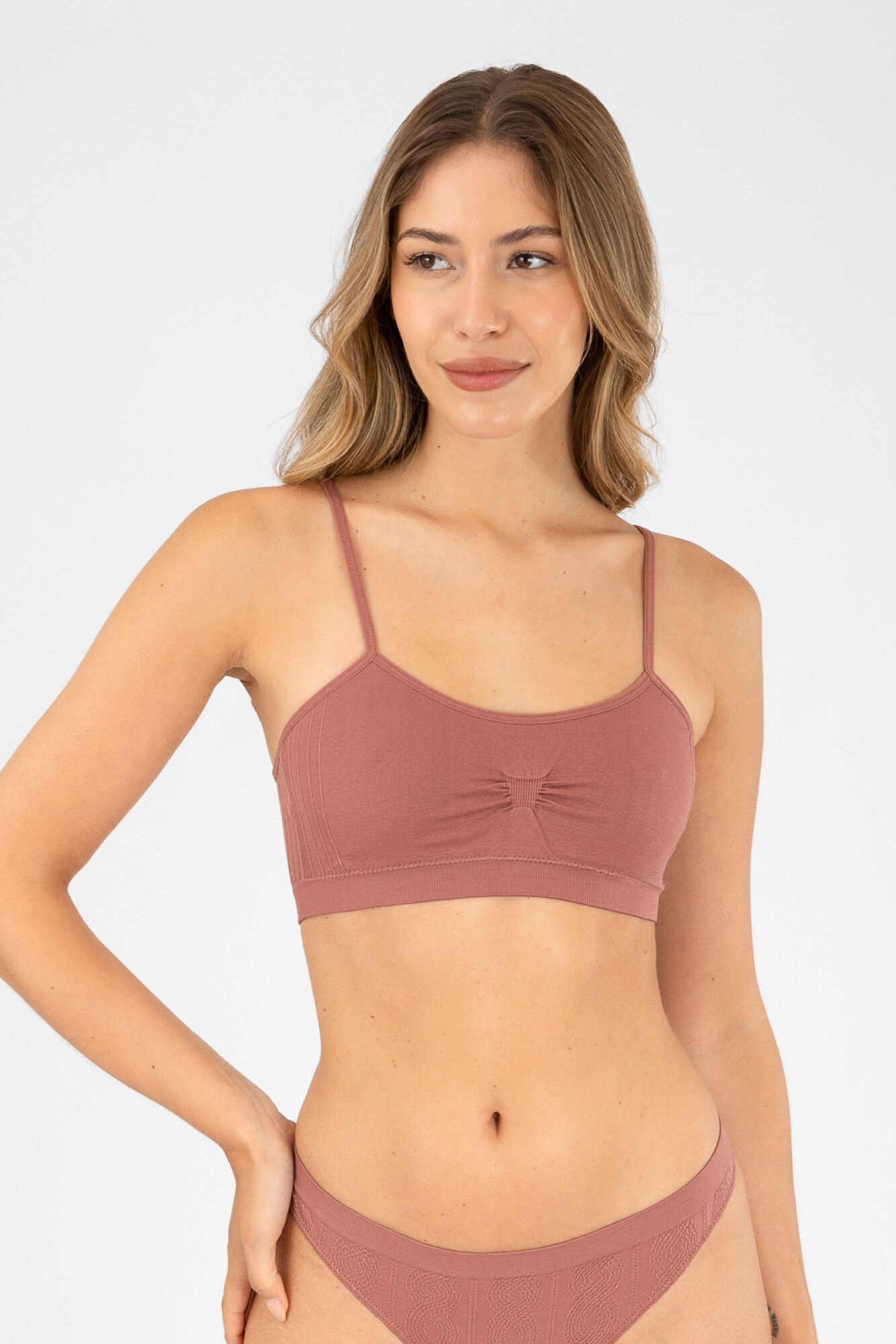 Soutien de bretel fino en tejido de microfibra con relleno ligero extraíble y sin aro. Sin costuras para una mayor comodidad. Breteles ajustables.
