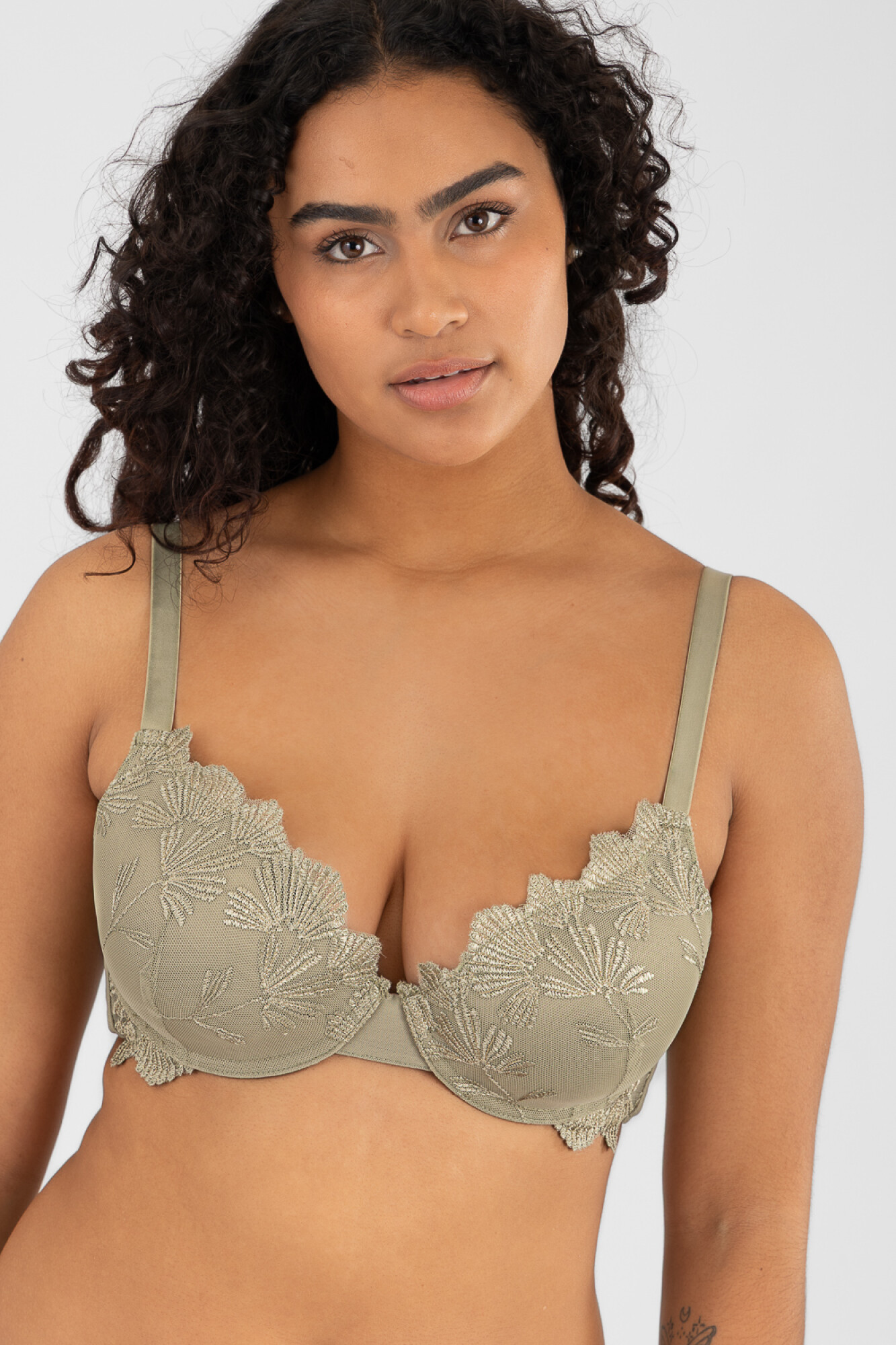 Soutien de copa B y C con bordado botánico en las copas. Parte trasera reforzada con doble tul liso para mayor soporte. Talle C con silueta en U para firmeza y seguridad. Breteles regulables con doble bretel delantero. Elástico trabajado en la espalda aporta delicadeza. Broche trasero de 4 posiciones. Glamuroso y femenino.