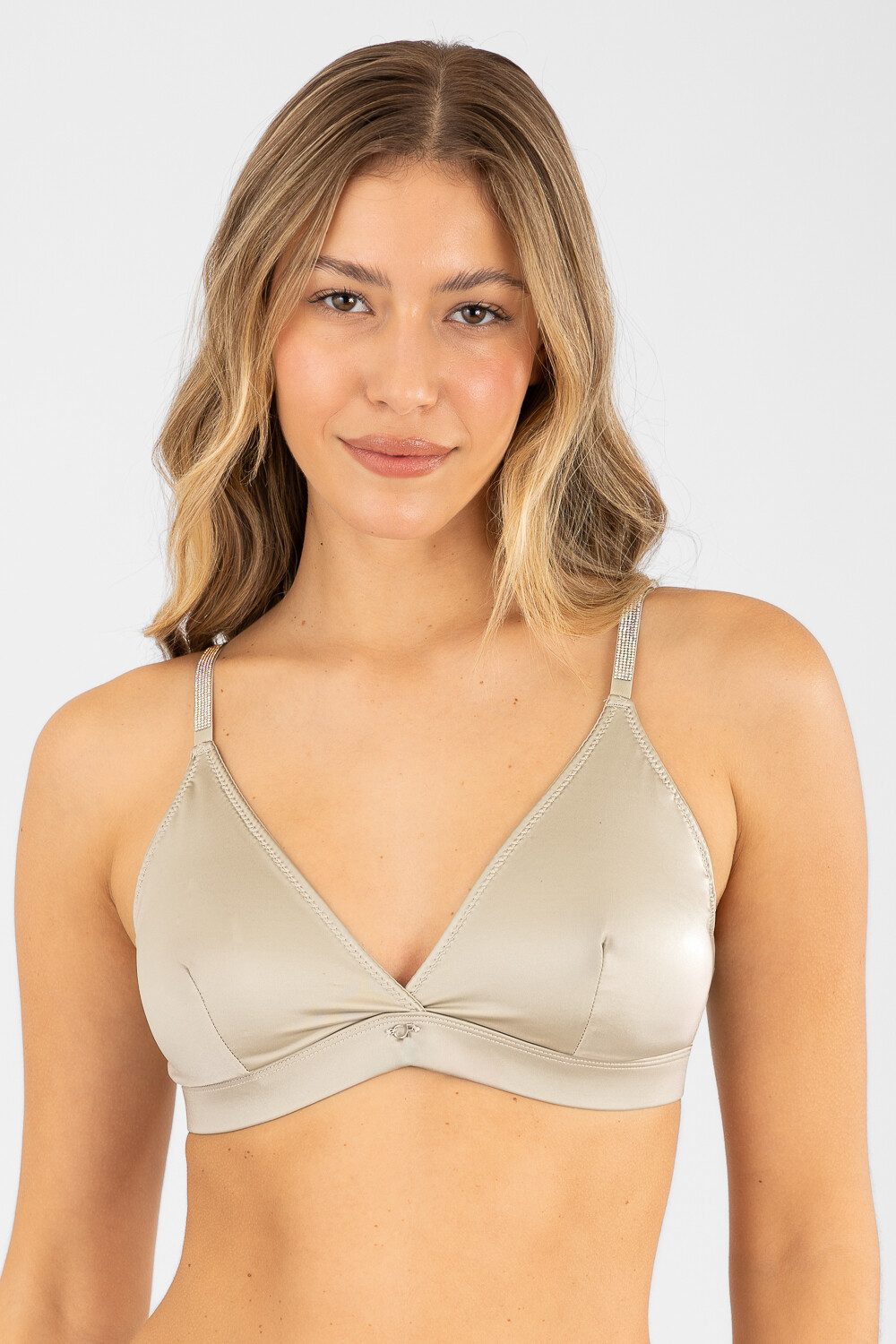 Bralet con escote triangular sin aro y copa removible. Detalle metálico CF en el frente. Breteles regulables con strass en los delanteros. Broche trasero de 4 posiciones. Sensual y con glamour ideal para ocasiones especiales.