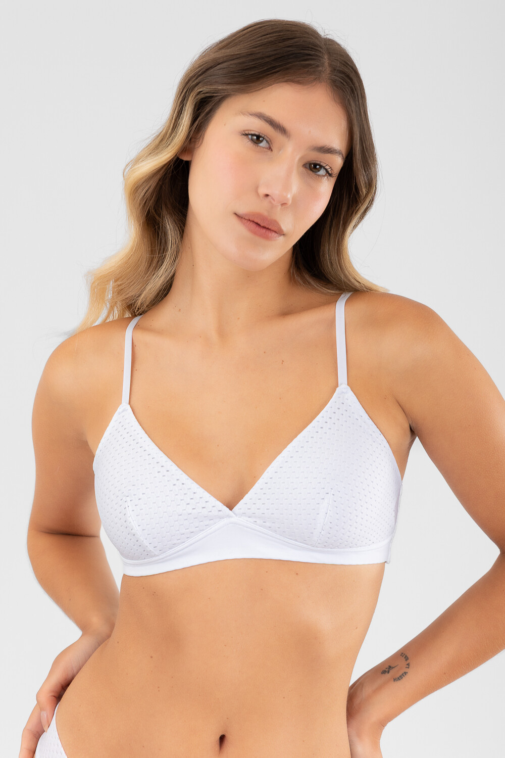 Bralet de copa triangular removible sin aro. Tejido doble en la espalda que aporta mayor sujeción. Breteles regulables y broche trasero de 4 posiciones. Suave fresco y cómodo para todos los días.