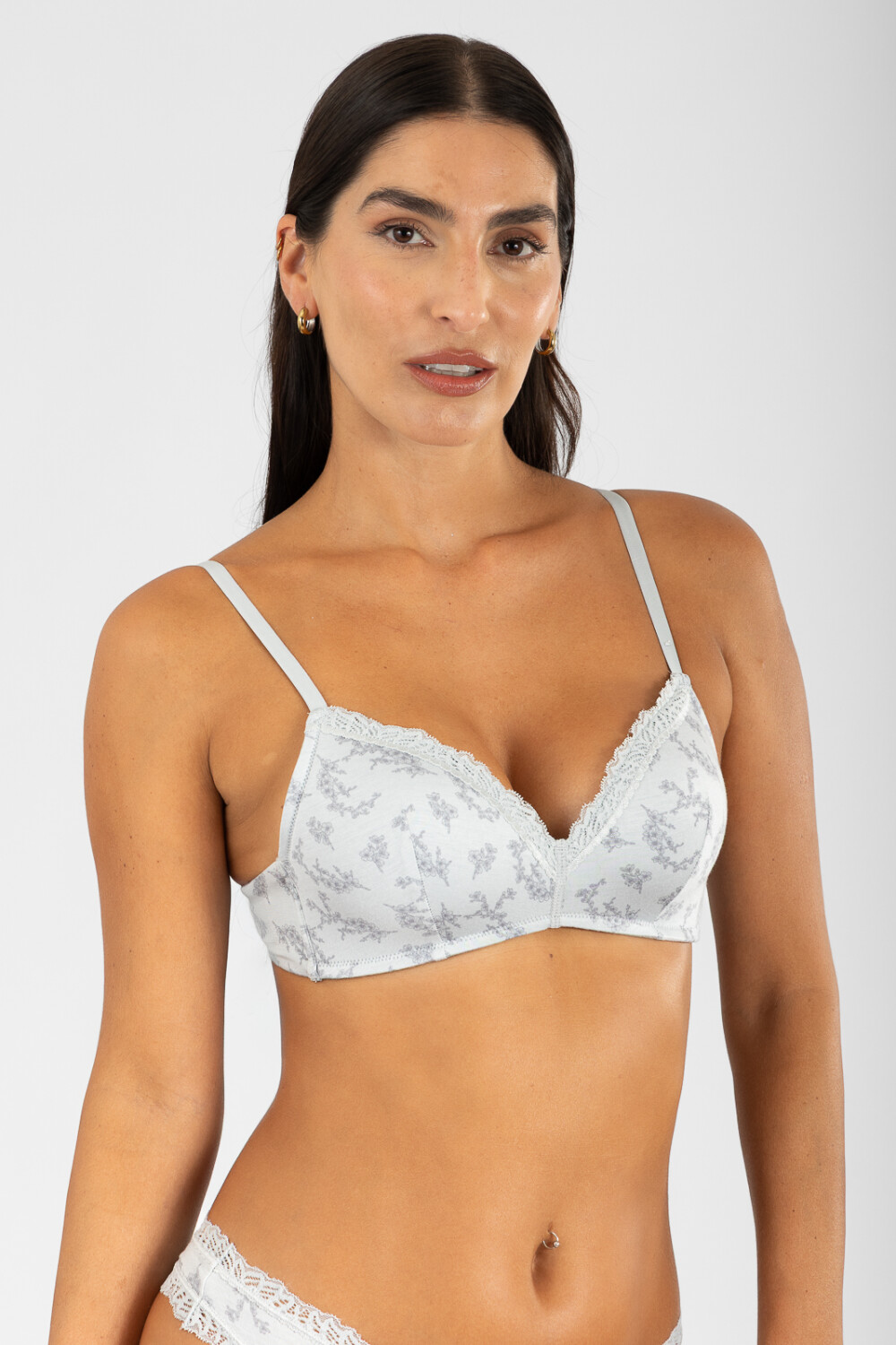 Soutien copa B con escote triangular sin aro confeccionado en suave microfibra estampada con diseño floral. Detalles de encaje en el escote que aportan un toque femenino. Laterales con doble tejido para mayor sujeción. Breteles regulables y broche trasero de cuatro posiciones. Diseño cómodo ideal para todos los días con un toque romántico.